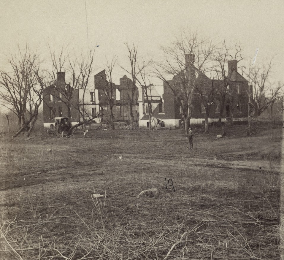 At the time of the Battle of Spotsylvania, Sarah Buckner Spindle lived on her farm just north of town on Brock Road. She was the second wife of Benjamin Spindle, who had purchased over 300 acres from its previous owner, his first father-in-law. Benjamin Spindle died in early 1860, leaving the house and 50 acres to Sarah, and even more land to their two children. That year’s census also lists three other adults and two children in the household. Nineteen enslaved individuals worked on the farm. The Army of the Potomac’s Fifth Corps arrived on their heels, making several assaults across the Spindle farm. During the fighting on May 8, Federal sharpshooters occupied the house, with Sarah Spindle still in it. The Confederates, determined not to allow their foes to use the structure to advantage, sent artillery shells into it, which caught it on fire. John Coxe, who served in 2nd South Carolina remembered, “And then I saw a sight I never wanted to see again. A woman bareheaded, her long hair streaming behind, ran out of the big house and across the field between the two fighting armies and reached shelter in the woods on the Po River.” Apparently, the Spindle House was never rebuilt.