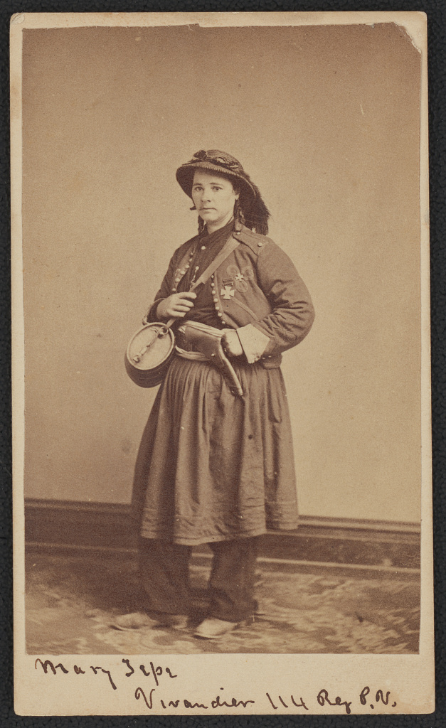Since the 114th Pennsylvania soldiers seemed to know this woman well, one wonders if Galwey perhaps confused Annie Etheridge with Marie “Mary” Tepe, who served as a vivandiere, in two Pennsylvania regiments, one of which was the 114th, a Zouave unit. Born Marie Brose, in France in 1834, she married Bernhard Tepe and the couple emigrated to Philadelphia in the 1850s, where Mr. Tepe began a tailor business. When he enlisted in the 27th Pennsylvania, Marie went with him and served the regiment in a variety of roles. She nursed sick soldiers, she sold goods, including tobacco, alcohol, and food to the soldiers. She also did cooking, laundering, and sewing work for pay. A falling out occurred between Marie and her husband, possibly over missing money she had earned. Whatever the reason, Marie left the 27th and later joined up with the 114th Pennsylvania, also known as Collis’ Zouaves.