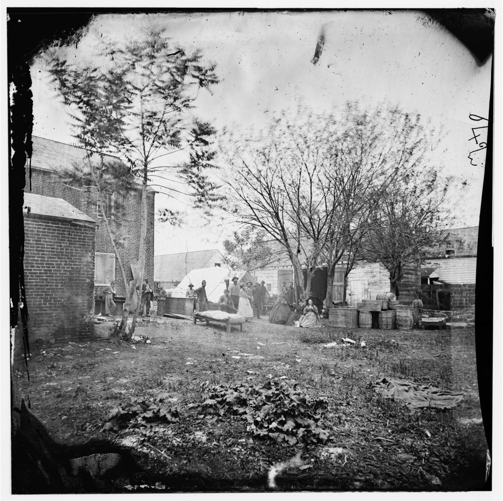 This May 1864 photograph shows a group of USSC workers, including women, in Fredericksburg.