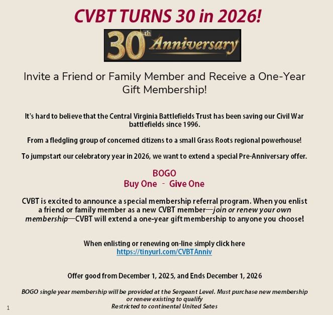 Central Virginia Battlefields Trust (CVBT) is a 501(c)(3) organization. TAX ID 54-1828344. Contributions are tax deductible. Consult your tax advisor for more information.