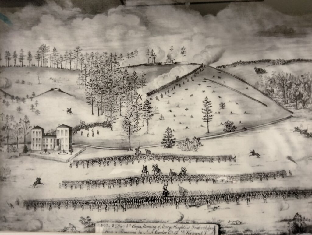 To assault the heights west of Fredericksburg, Howe formed three “storming columns” on the morning of May 3. Two of the columns involved Vermont Brigade regiments led by Col. Grant, and Col. Thomas Seaver of the 3rd Vermont. The majority of both Grant’s and Seaver’s columns moved west to assault the Confederate defenders on Telegraph (Lee’s) Hill and Howison Hill. Much of this attack crossed the flat plain of ground where the CVBT office now sits. In 2022, CVBT helped save some of the nearby greenspace that the Vermonter’s marched over. Additionally, some of the 6th Vermont attacked the southern end of Marye’s Heights along with Brig. Gen. Thomas Neill’s column.