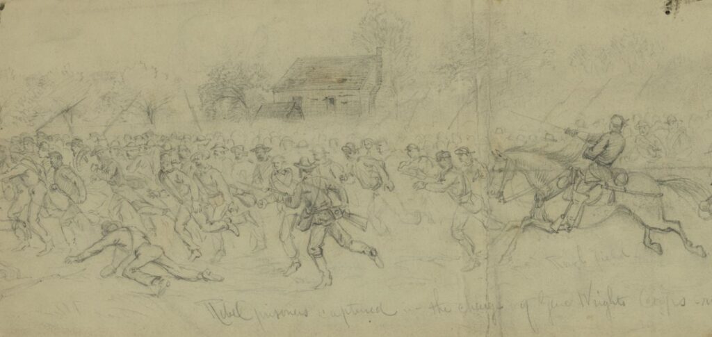 This sketch by Alfred Waud shows the prisoners netted by Col. Emory Upton’s assault on May 10, 1864, being sent to the Federal rear. While Upton’s twelve regiments captured about 1,000 prisoners, they lost a similar number in casualties.