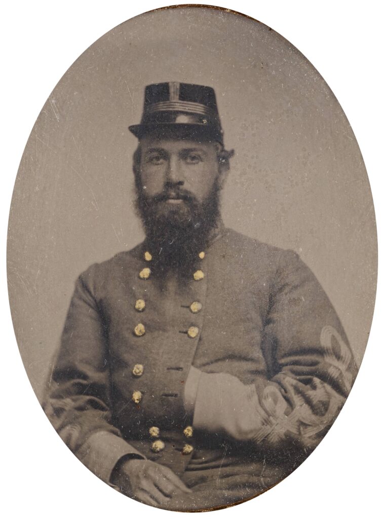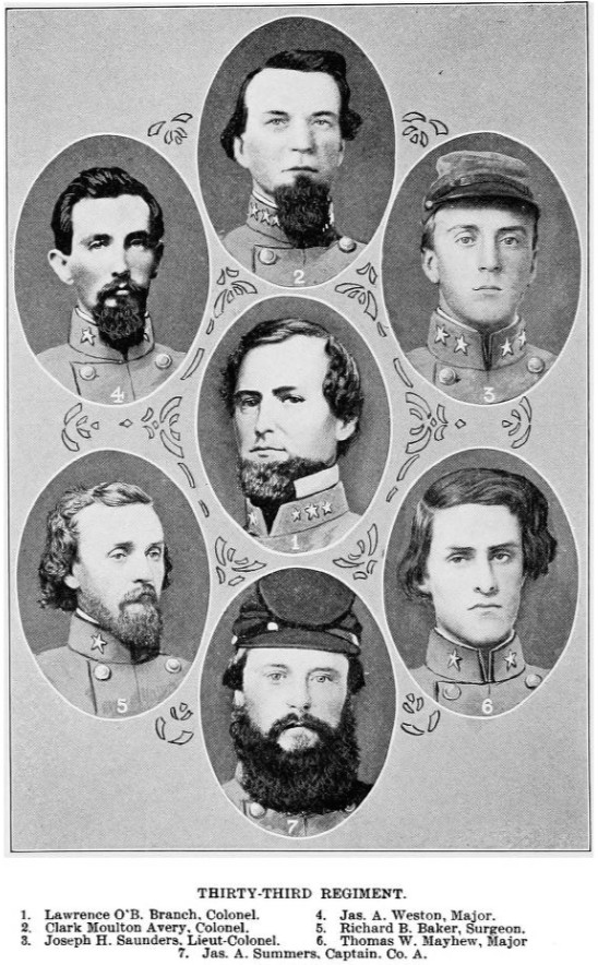 Partly inspired by the bravery of its colonel, Clark Moulton Avery, the 33rd maintained its place in line for a time. Standing behind some improvised works, Col. Avery was heard to say, “we will give them one volley before we go,” when he received a wound to left arm. Attempting to further inspire his men, Avery remained on the field, albeit on a stretcher, before finally retreating. He was hit four more times during the withdrawal. He died a month and a half later from his wounds.