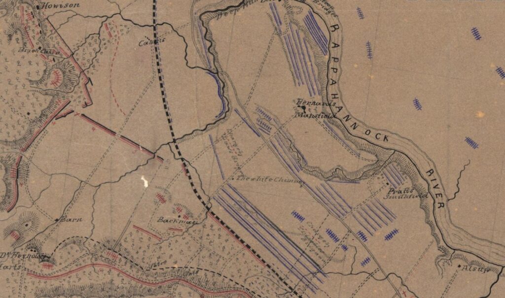 Lane’s brigade fought along the Richmond, Frederickburg, and Potomac Railroad where it makes the bend as shown on this map.